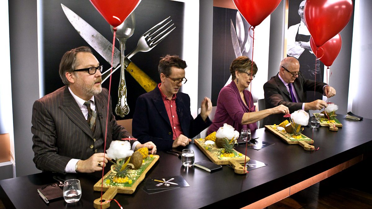 It is decision time for the chefs from the central England region. One chef left the competition yesterday and only two remain to cook their entire menus for judges Prue Leith, Matthew Fort and Oliver Peyton. The panel is joined by guest judge, comedian and actor Jim Moir, known to millions as Vic Reeves. The judges are not easily pleased and only world class cooking will do.
