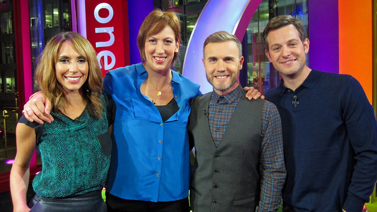 Matt Baker and Alex Jones are joined by Gary Barlow and Miranda Hart. Plus, the battle between bicycles and HGVs on Britain's streets, the story of the Royal Navy's worst submarine disaster, Phil Tufnell looks at how to sell a dinosaur, and there is an attempt to create a wine glass orchestra.