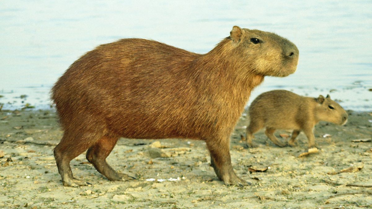 The capybara is the world's largest rodent: it is the size of a sheep, barks like a dog and is happy in the water and on land. Carla spends her days grazing and swimming. Baby capybaras start swimming at just a few weeks old.