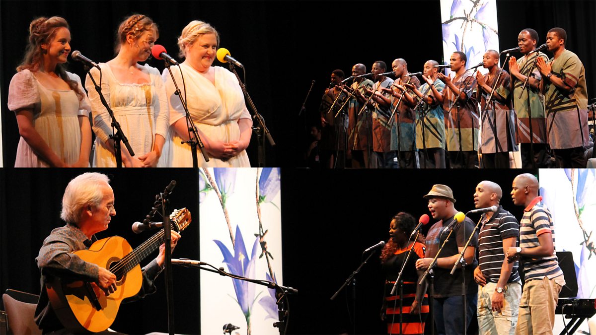 Janice Forsyth presents a special programme live from The Hub in Edinburgh, home of the Edinburgh International Festival which starts today. Janice is joined by world-renowned flamenco guitarist Paco Peña, whose latest work is inspired by the writings of Federico García Lorca. Ladysmith Black Mambazo sing live, and choreographer Mark Baldwin and composer Ella Spira talk about creating "Zulu Ballet" Inala. And South African playwright Brett Bailey discusses his work Exhibit B, inspired by Victorian ethnographic exhibitions, which places Africans in display cases in an examination of colonial history and attitudes towards immigration.