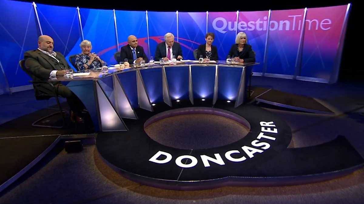 David Dimbleby presents topical debate from Doncaster. The panel includes Sajid Javid, Yvette Cooper, Shirley Williams, Omid Djalili and Jill Kirby.
