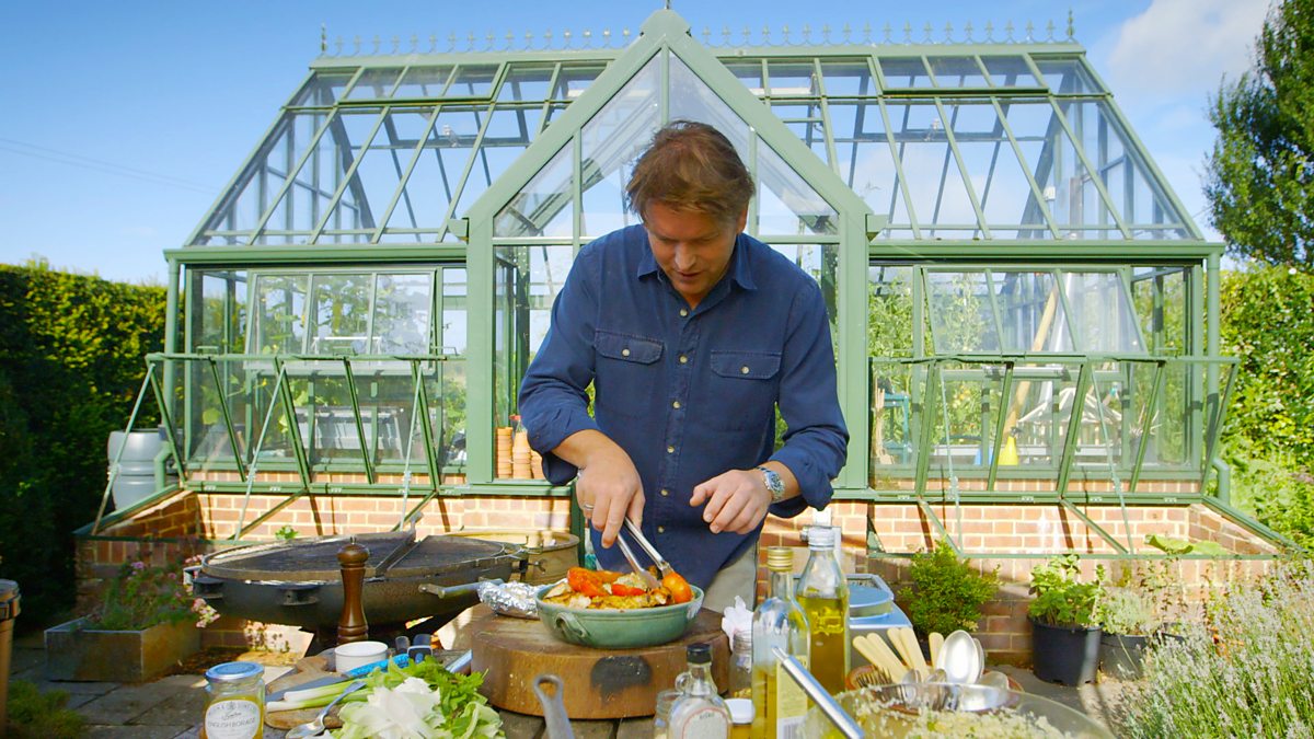 James sparks up a barbecue right in the heart of his own vegetable garden. He makes mouthwateringly fresh dishes that go from the patch to the plate in minutes.