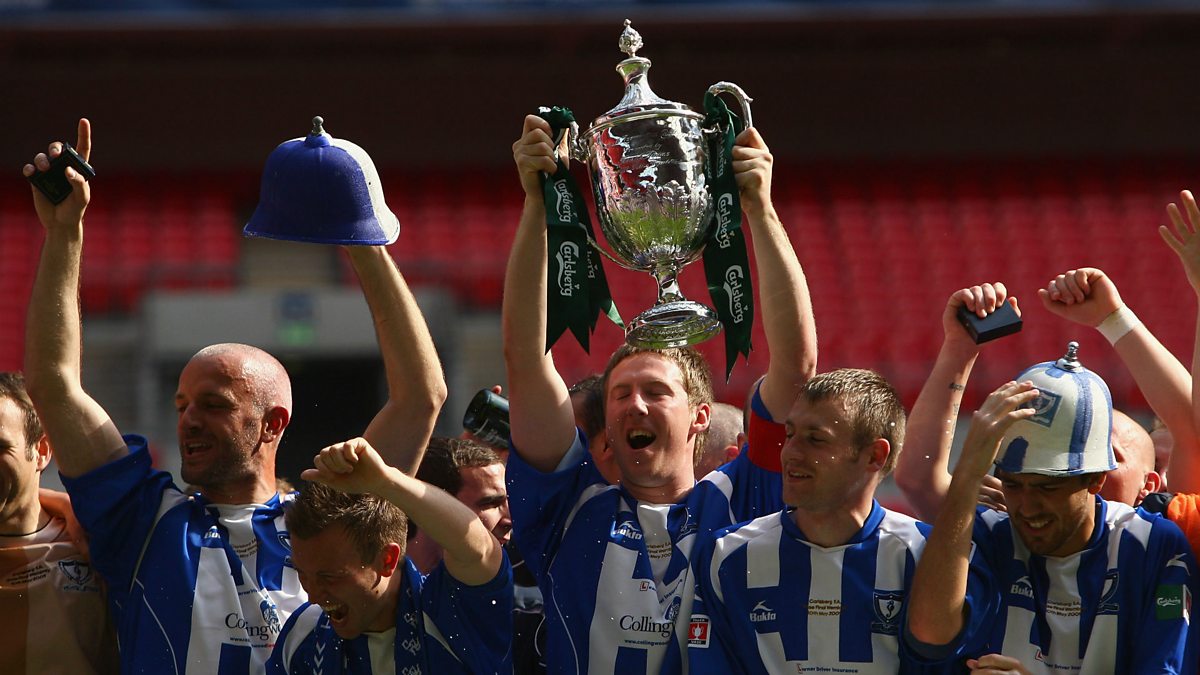 Photo: Whitley Bay players celebrate with the trophy after winning the FA Vase Final between Glossop North End and Whitley Bay at Wembley Stadium in 2009 (CREDIT: Ian Walton/Getty Images)