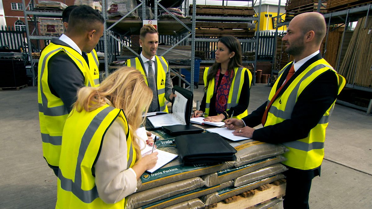 It's halfway, and it's hard graft. Donning hi-vis jackets and steel-toe-capped boots, the candidates travel to meet Lord Sugar in a south London builder's yard. Their task is to set up and run a handyman business.