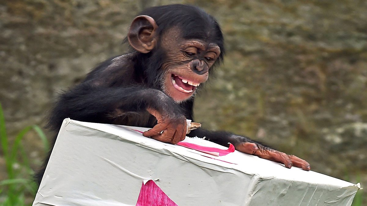 Photo: A 15 month old chimpanzee opens a present (Getty Images).