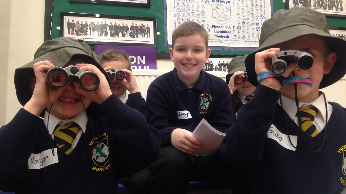 Ymweliad ag Ysgol Morswyn yng Nghaergybi i sgwrsio â rhai o'r adaryddion ifanc yno. Aled meets young bird-watchers at a primary school on Anglesey.