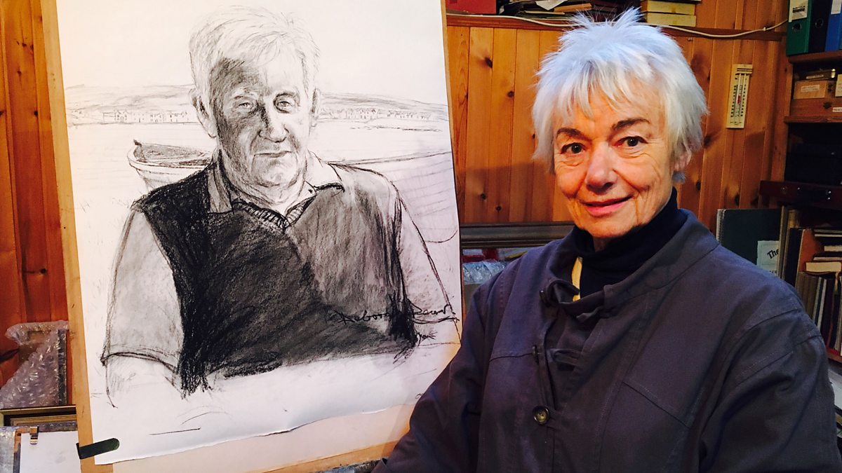 Nì Fraoch Nic an Deòir dealbh dubh is geal dhen iasgair Ìleach Seumas MacPhàrlain. Heather Dewar draws a charcoal portrait of Islay fisherman James MacFarlane.