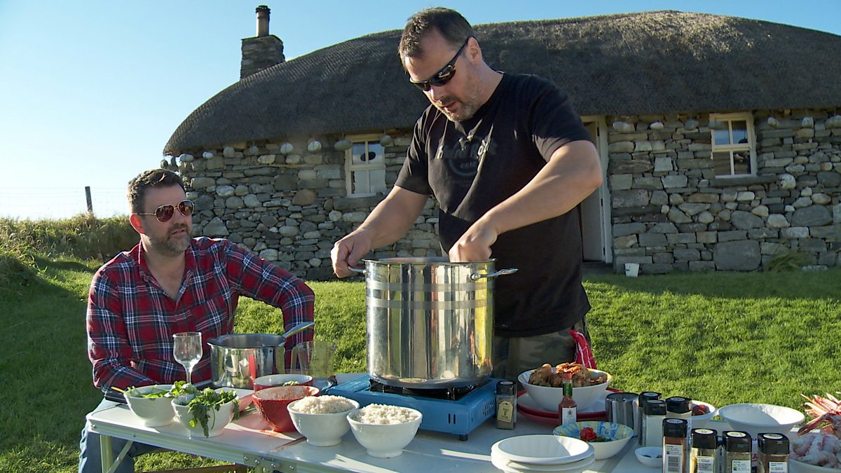 The lads head out of the kitchen to the Isle of Harris, where they visit Roddy's father for some of his delicious home-grown machair potatoes. They also spend time with his cousin on the beach raking for cockles to make his own version of New England chowder.