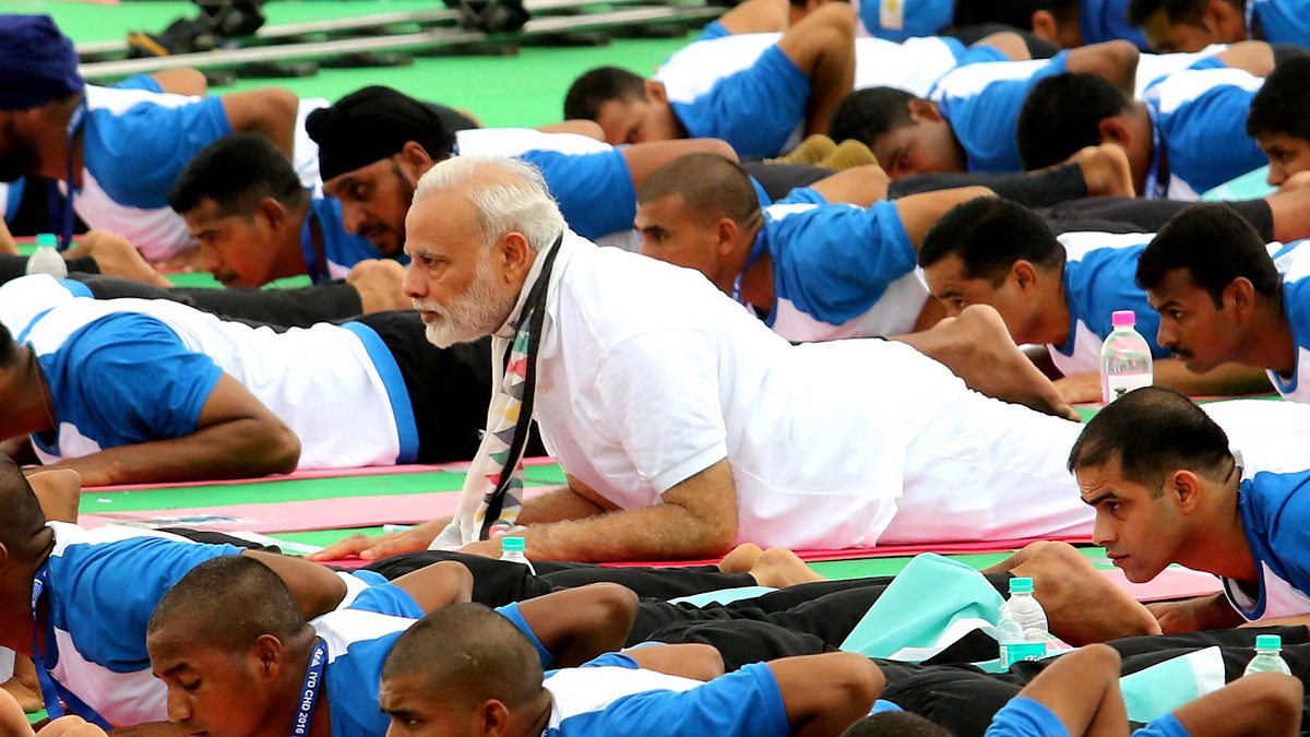 Image: Indian Prime Minister Narendra Modi participates in a mass yoga session to mark the International Day of Yoga on 21st June, 2016 in Chandigarh, India. Credit: Getty Images.