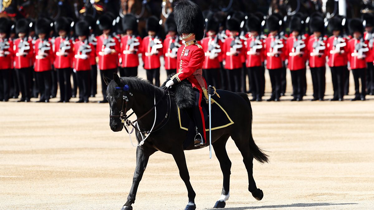Huw Edwards introduces live coverage of the world-renowned military parade to mark the official birthday of Her Majesty The Queen. This year the 1st Battalion Irish Guards troop their colour in this annual display of pageantry and music. After the parade, members of the royal family will join the Queen at Buckingham Palace to continue the celebrations with the famous balcony appearance and flypast.