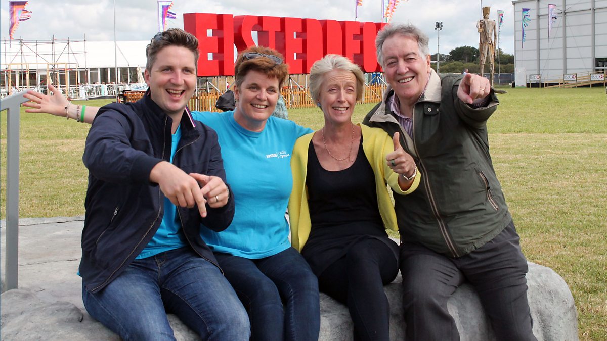 Hywel Gwynfryn, Rhiannon Lewis, Nia Lloyd Jones ac Ifan Evans yn darlledu o Fodedern. Hywel Gwynfryn, Rhiannon Lewis, Nia Lloyd Jones and Ifan Evans broadcasting from Bodedern.
