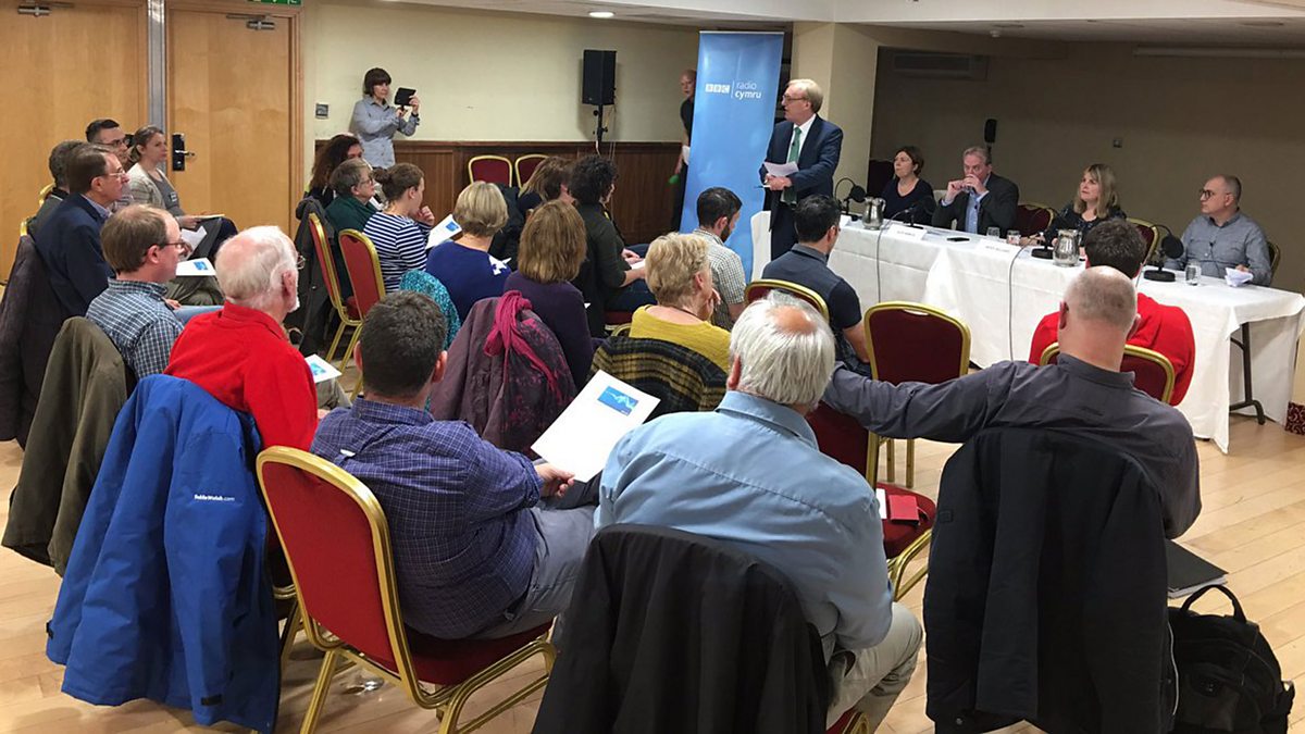 Trafodaeth wleidyddol o flaen cynulleidfa yn Nulyn, gyda Dewi Llwyd yn cadeirio.