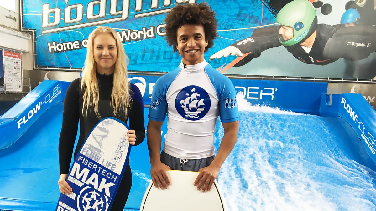 Radzi learns the art of indoor surfing and takes part in a display routine with two pro-surfers.