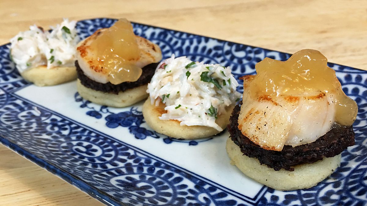 The lads prepare a variety of party snacks, with Uisdean cooking roast beef in Yorkshire pudding and salmon en croute, while Roddy prepares gravaldax, crab, scallop, black pudding blinis and haggis balls.