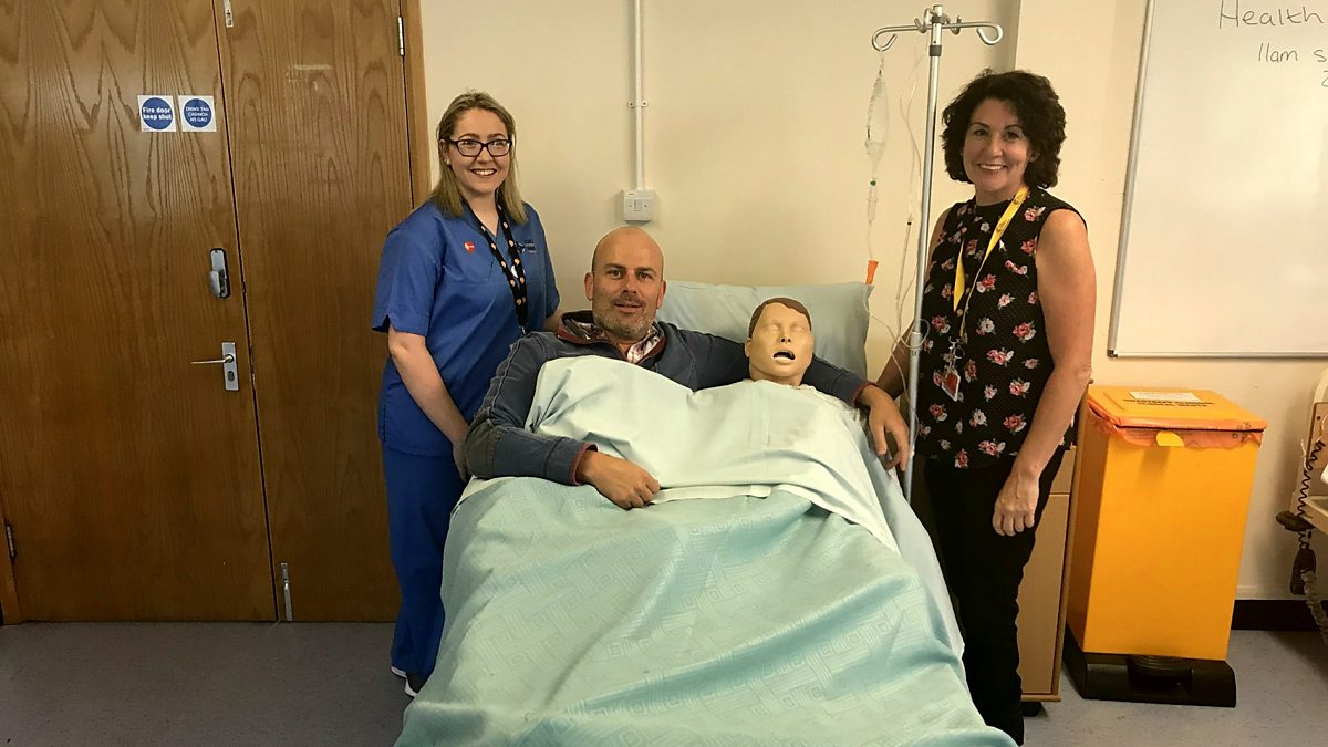 Sut nyrs fyddai Aled? Mae'n cael rhywfaint o hyfforddiant ym Mhrifysgol Bangor. Aled gets a taste of nursing at Bangor University.