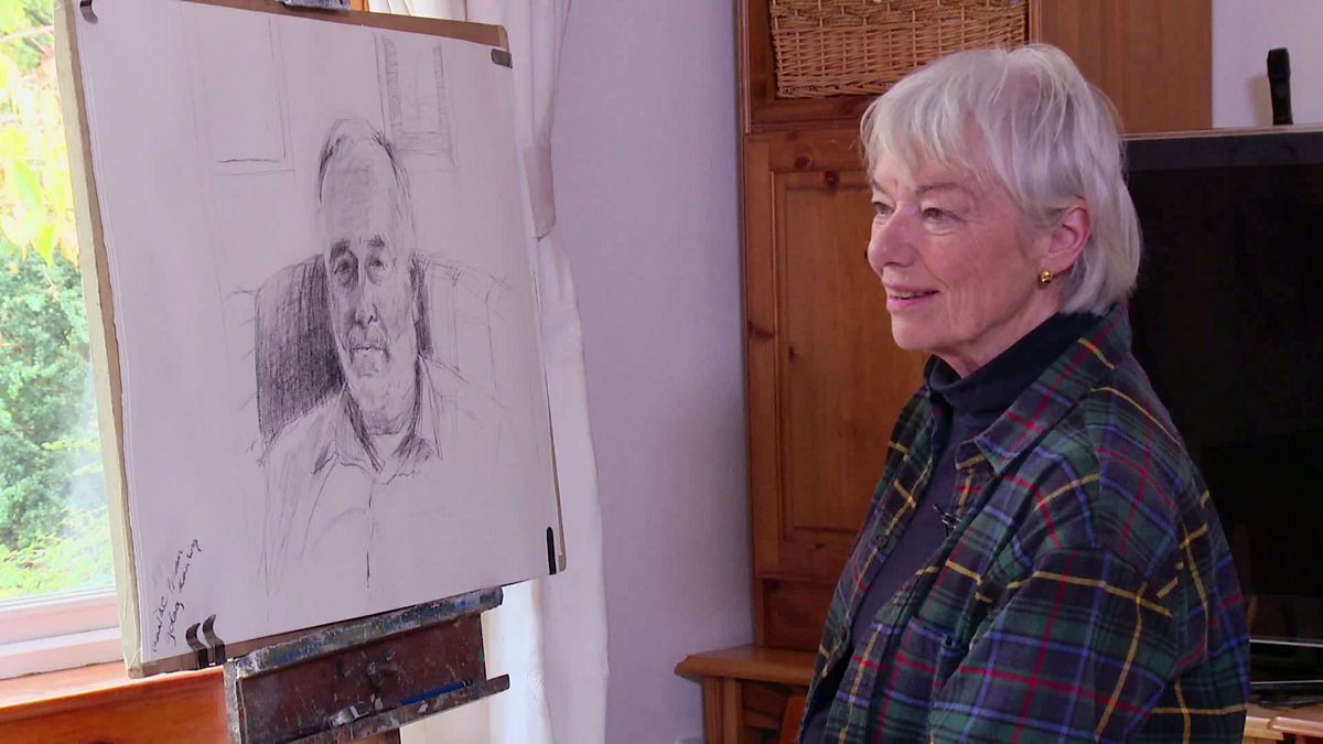 Fraoch Nic an Deòir a' dèanamh dealbh dubh is geal dhen ùghdar Ruairidh MacIlleathain. Heather Dewar draws a charcoal portrait of author and educator Roddy Maclean.