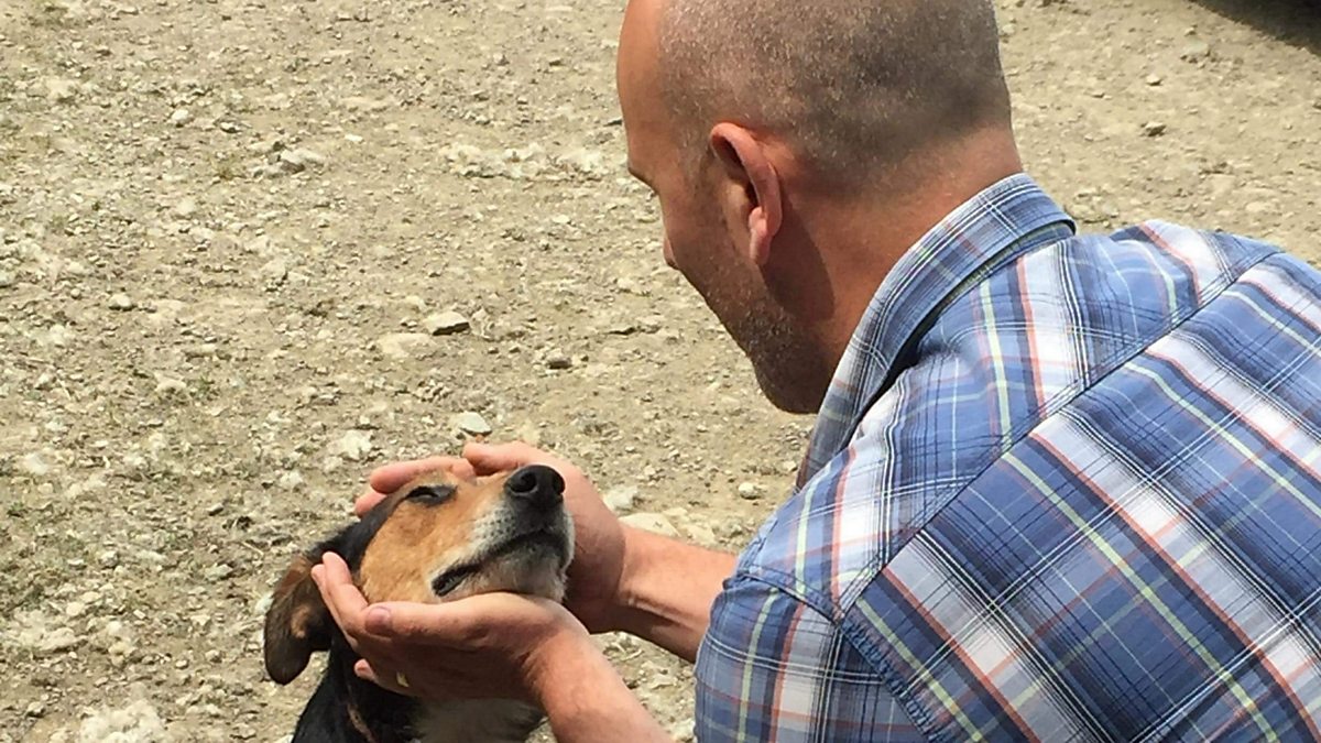 Bob Williams o Henllan yw'r athro amyneddgar sy'n dysgu Aled sut i redeg ci defaid. With a little help from Bob Williams, Aled learns how to train a sheepdog.