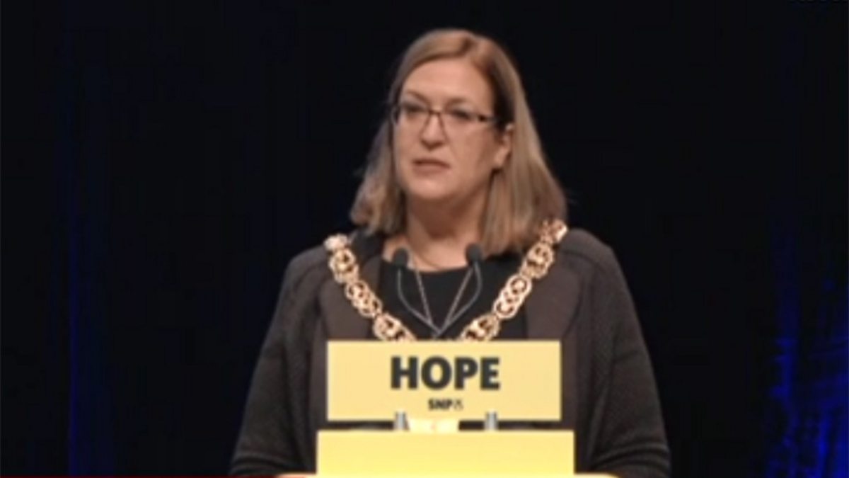 Recorded coverage of proceedings at the Scottish National Party conference in Glasgow on Sunday 7 October. Including a welcome speech by lord provost of Glasgow Eva Bolander and justice secretary Humza Yousaf MSP addressing conference.