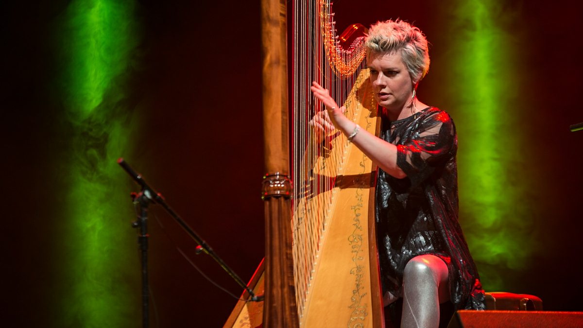 Y delynores Catrin Finch yw un o westeion Shân Cothi.