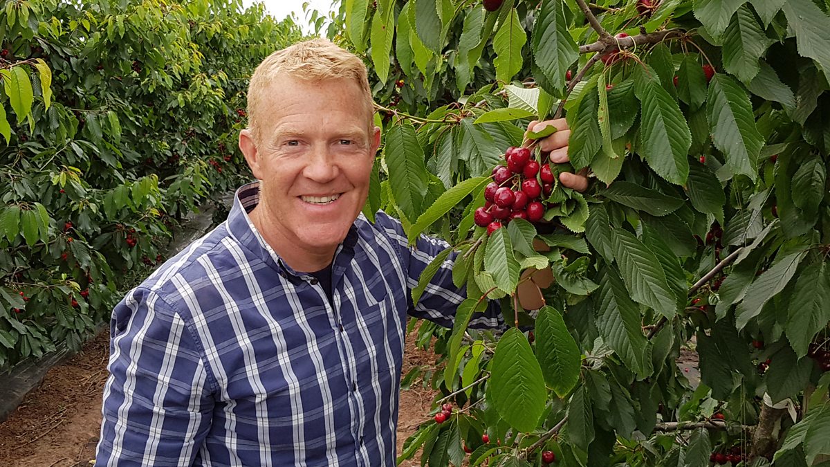 Adam travels to Lower Hope Farm in Herefordshire where their cherry harvest is in full swing. He meets young assistant manager, Ed Turner and gets a guided tour of the cherry picking in the poly-tunnels – learning how to pick the perfect cherry for himself. Adam helps out by clambering aboard a tractor and driving a trailer full of cherries over to Lower Hope’s packhouse. He meets Emily Cliff there for a tour of their cherry grader and packaging facilities, before unwinding with a cherry themed picnic in the summer sun.