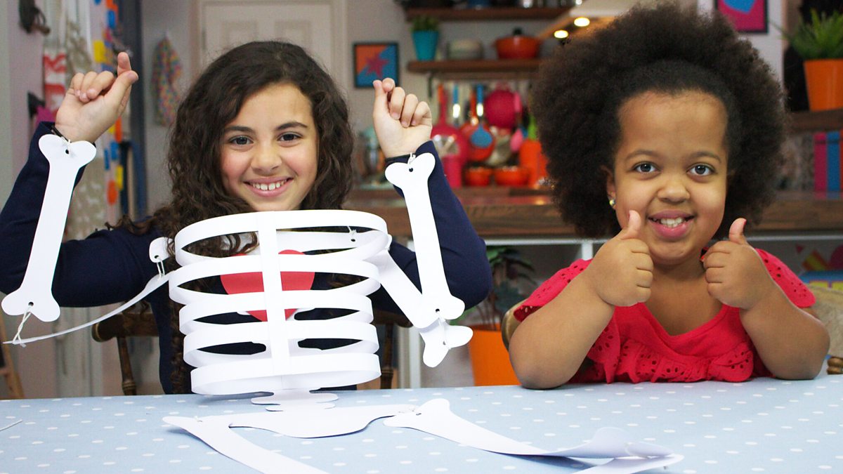 Cara makes no bones about crafting a scarily good skeleton suit for Georgia, while Curtis and Stanley turn cheese and pretzels into tasty witches' brooms. With a jam jar pumpkin lantern and ghostly balloons too, it all makes for a spookily good Halloween-themed party.