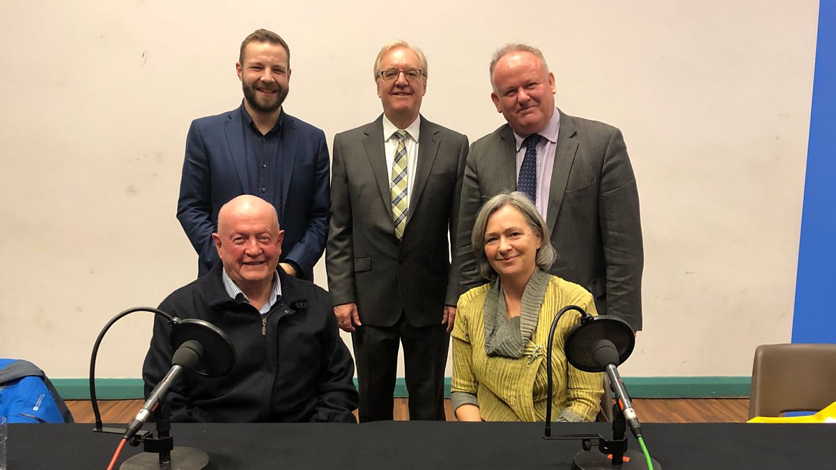 Trafodaeth wleidyddol o flaen cynulleidfa ym Methesda, gyda Dewi Llwyd yn cadeirio. Dewi Llwyd chairs a political discussion in front of an audience.