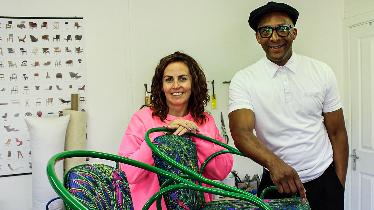 Jay Blades enlists woodworker Ollie Allen and upholsterer Sharon O'Connor to bring back to life an old shelving unit and a pair of garden chairs.