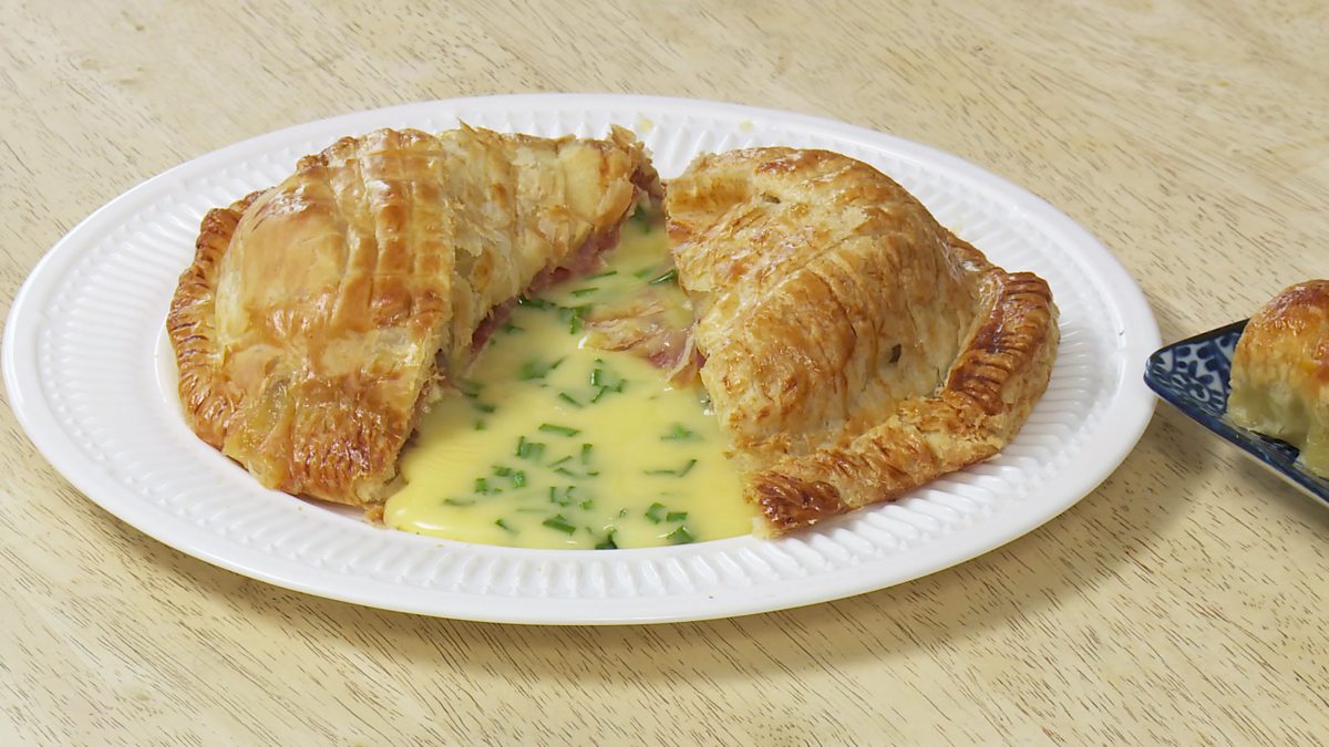 Ruaridh makes gourmet sausage rolls, one with pork black pudding and apple, the other with beef, mustard and cheese. He also makes a Camembert round in pastry.