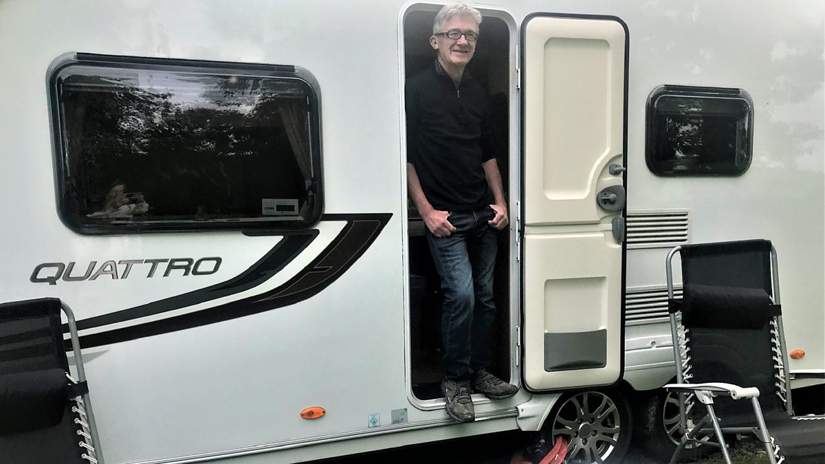 Mae Geraint yn sgwrsio hefo carafanwyr eisteddfodol profiadol: Nerys Williams, Dyfrig Davies, Siân Edwards, Sioned Roberts a Sioned Elin.