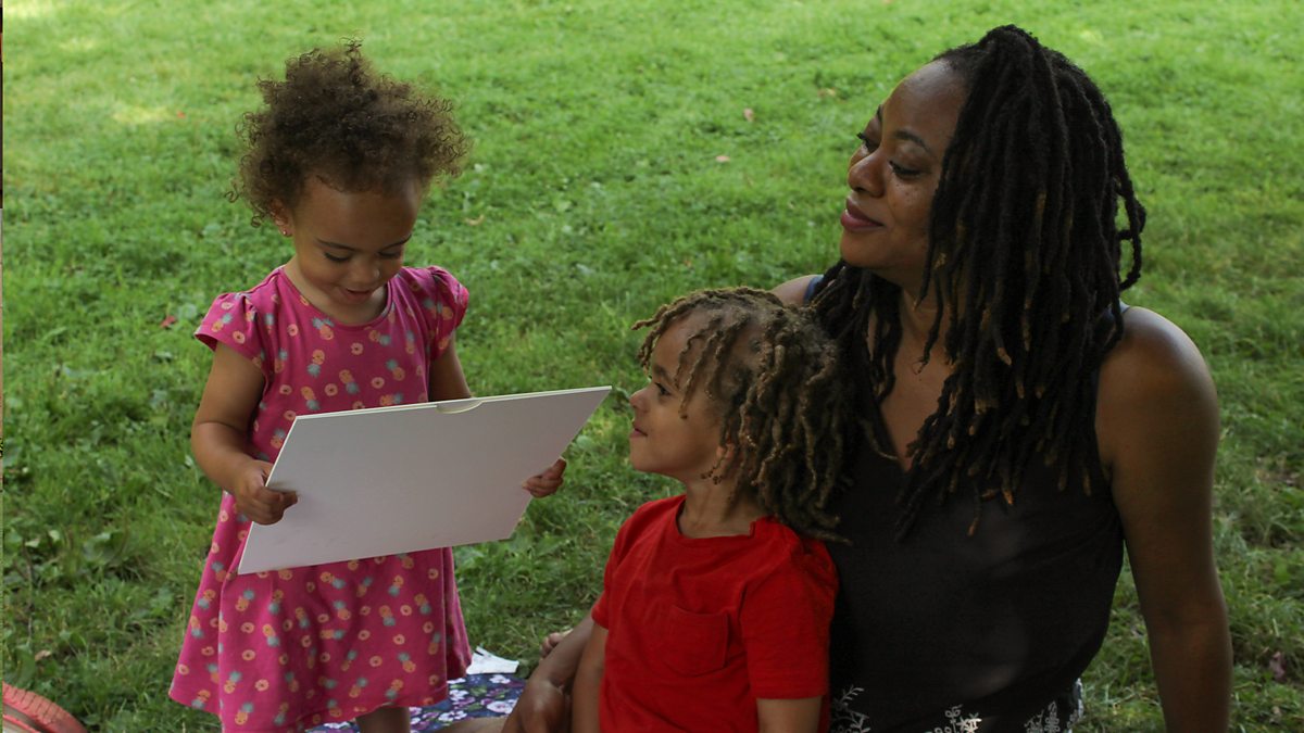 Ije’s family are now in the park, where they have a picnic and play snap. Isaac is in the garden with dad, where he plays finders keepers with painted rocks. Ije and mum put all of her mementos in a scrapbook, looking back at their day out. Finally, Isaac sits with mum and dad, sticking their photos from their day into a book to remember.
