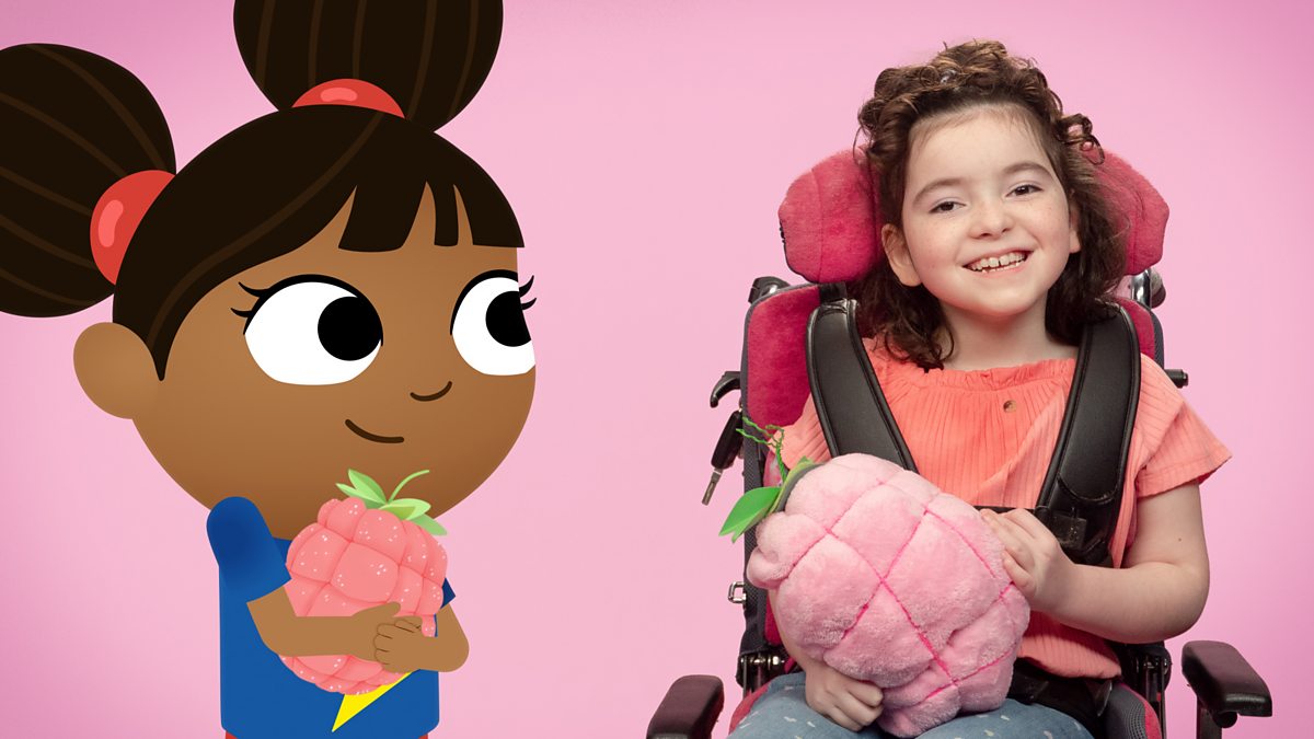Dee encourages a friend to say ‘raspberry’, and we go on a whirlwind word adventure. We see a red raspberry, a fancy hat raspberry and even meet Princess Raspberry!