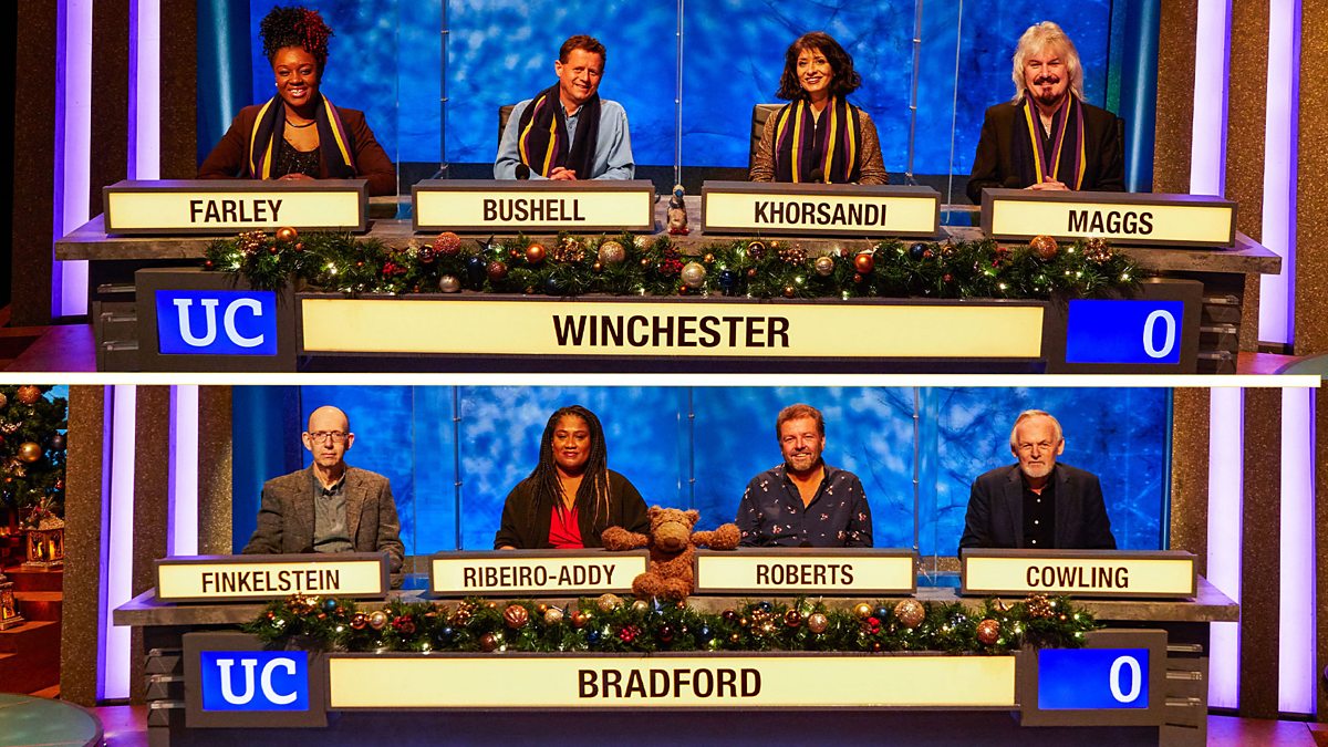 Playing for Winchester are comedian Shappi Khorsandi and sports presenter Mike Bushell. Their opponents on the Bradford team include MP Bell Ribeiro-Addy and property expert Martin Roberts.