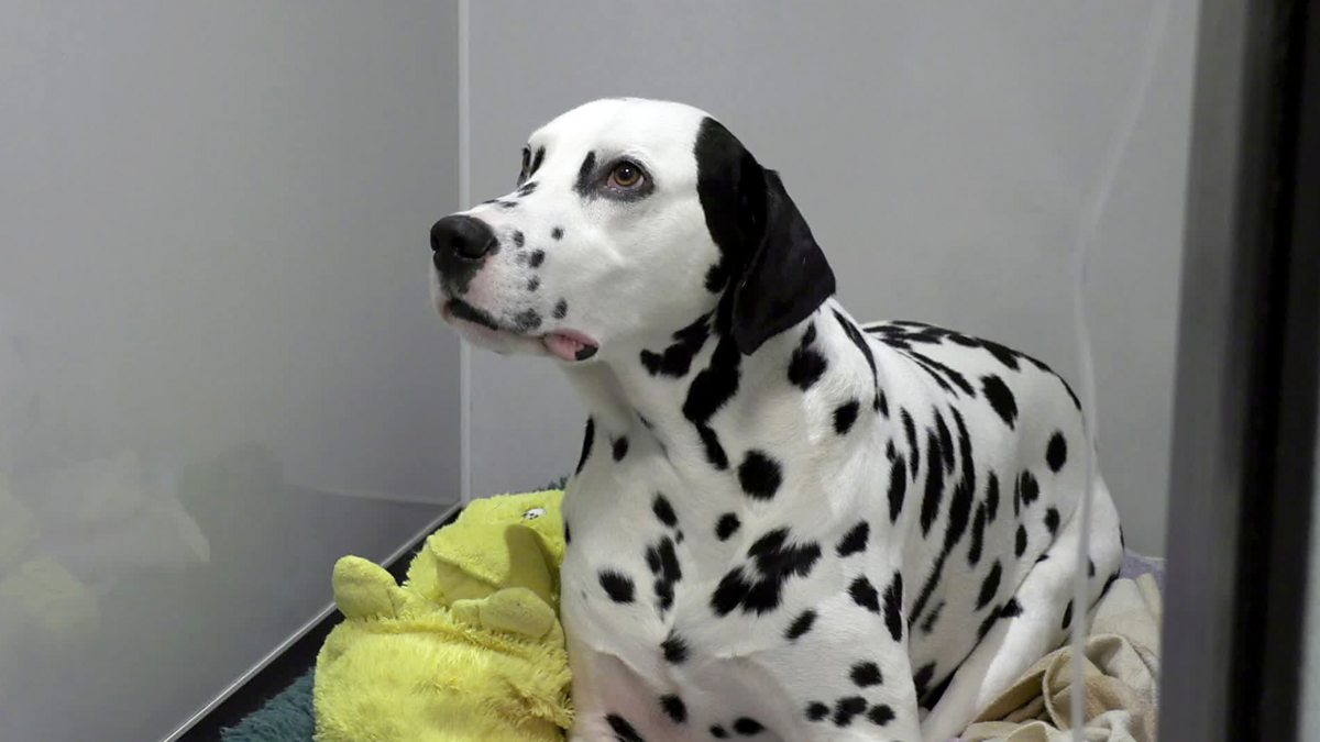 Ann an Siorrachd Obar Dheathain, tha Scott Rigg a’ cleachdadh sgana CT a dh’ fhaicinn am faigh cù Dalmatian faochadh bho obair-lannsa air a chnàimh-droma.