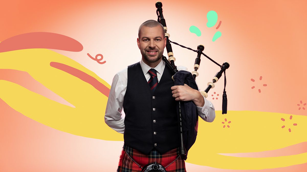 Bagpiper Kyle introduces us to his booming bagpipes. To make a sound, Kyle uses his breath and fingers in a special way.