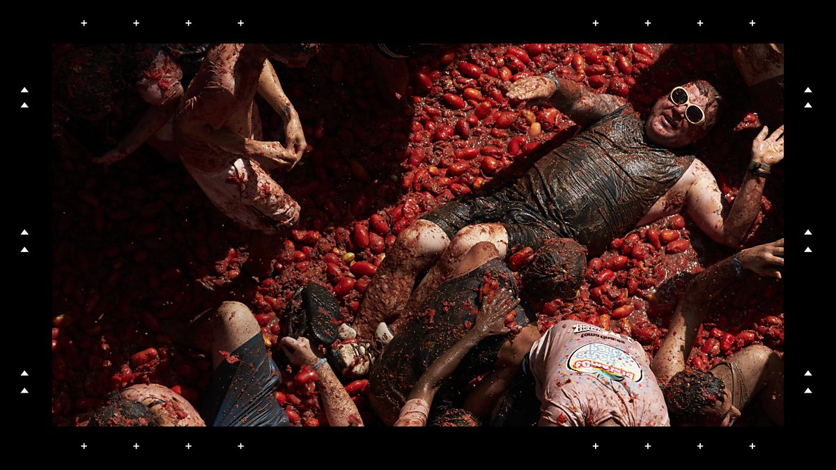An epic food fight, taking place on the streets of Spain. As seen from above.