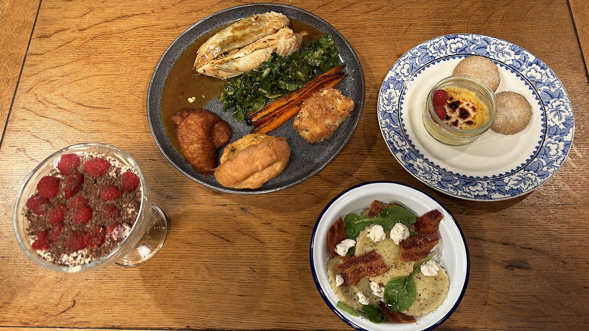 Tha Cearc Ròst, Yorkshire Pudding, Càl-cholaig le Sabhs Càise, Currain air an Ròstadh le Mil, Càl Hispi, Pommes Dauphines, Tiramisu, Girasoli, Crème Brulee agus Aran-goirid uile air an ullachadh às aonais gràn de chruithneachd no blasad de bhainne.