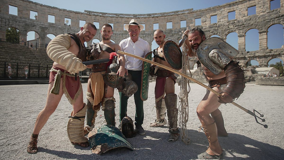 Michael Portillo mounts a valiant defence against fierce latter-day Roman gladiators in Pula's amphitheatre as he begins a journey across the Balkan countries of Croatia and Bosnia and Herzegovina.