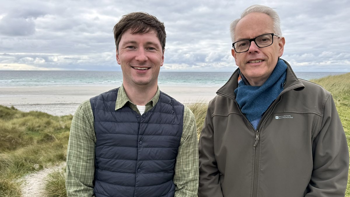 Ramsay MacMahon walks along the beaches of Barra with Michael Buchanan. Tha Ramsay MacMahon a’ coiseachd air tràighean Bharraigh le Mìcheal Bochanan.