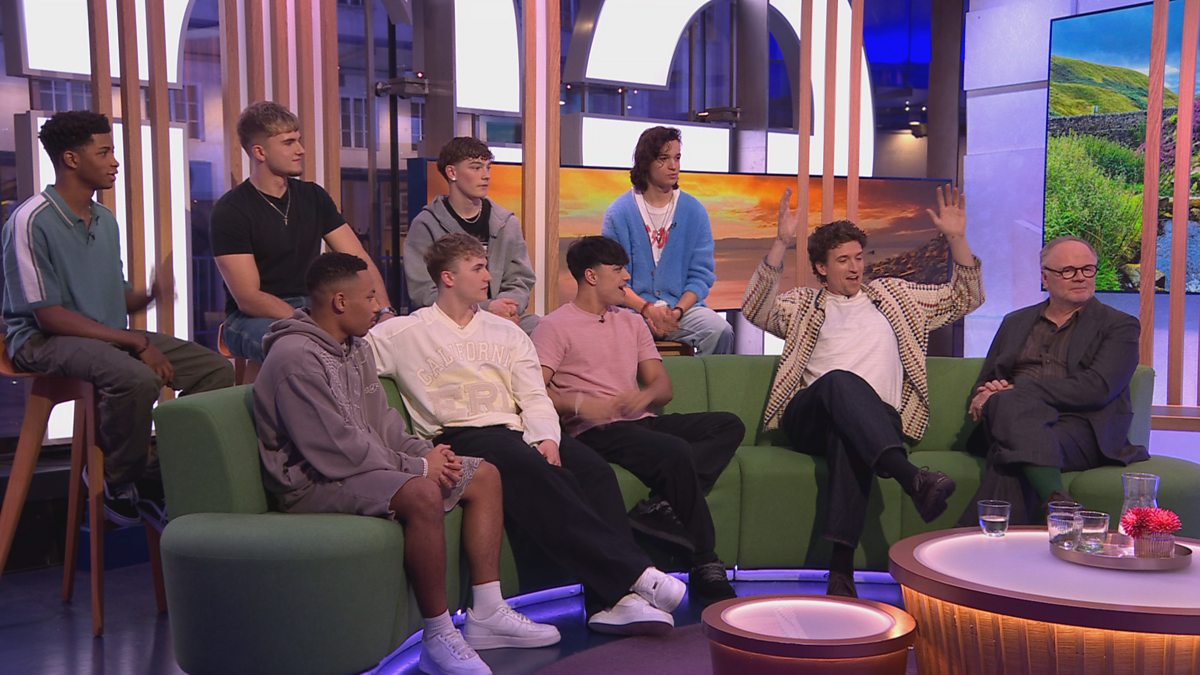 Jason Watkins, Greg James and boy band December 10 join Alex Jones and Roman Kemp on the sofa.