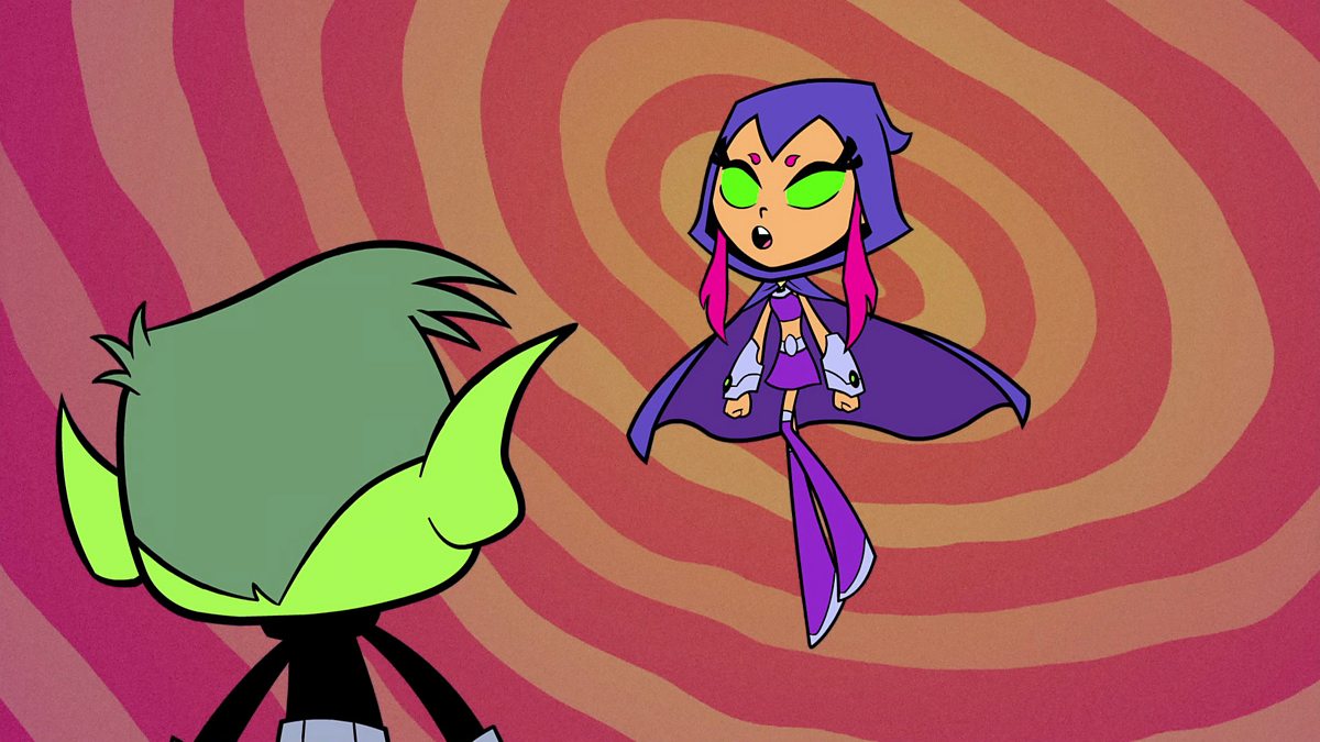 After Robin swipes her cloak, Raven's leggy figure is revealed.