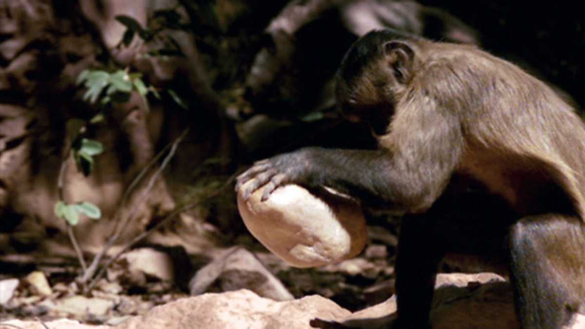Brown-tufted capuchins are highly intelligent creatures. They spend their nights in the safety of caves, emerging each morning to find food. Down in the valley is a particular favourite, a nut palm. The palms produce huge seeds, but have very stong shells that protect them against attack. For the capuchins, this is a war of attrition. They check which nut is ripest and tear the husk off. Then, rather than trying to crack the nut straight away, they drop it on the ground, because these Brazilian monkeys have learned that the nuts can be cracked only if they're left to dry out in the sun. After a week or so, the capuchins return to their stash and tap the nuts to see if they're ready. Then, using a flat rock as an anvil, they bash the nut with a harder variety of rock, or hammer, and crack open the tough nuts. Using separate tools in this way requires an exceptional level of intelligence and dexterity. Youngsters copy the behaviour from their parents, just like human toddlers, but it can take up to 8 years for them to learn the intricacies and source the right tools.