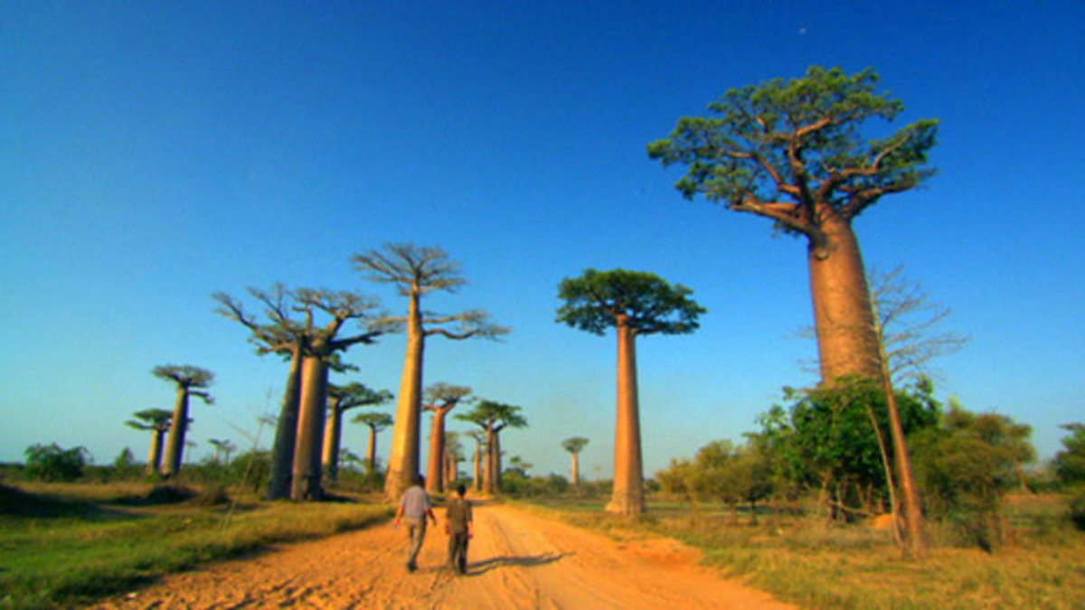 The unusual looking baobab tree can be found looking majestic in what is known as the Avenue of the Baobabs on Madagascar's west coast. These baobabs are all that's left of a once mighty, lush jungle. Their wood is bad for burning and buildling, and so these remnants have been left alone by the local people. All the other trees have gradually vanished leaving a barren grassland, void of a once rich diversity of wildlife.