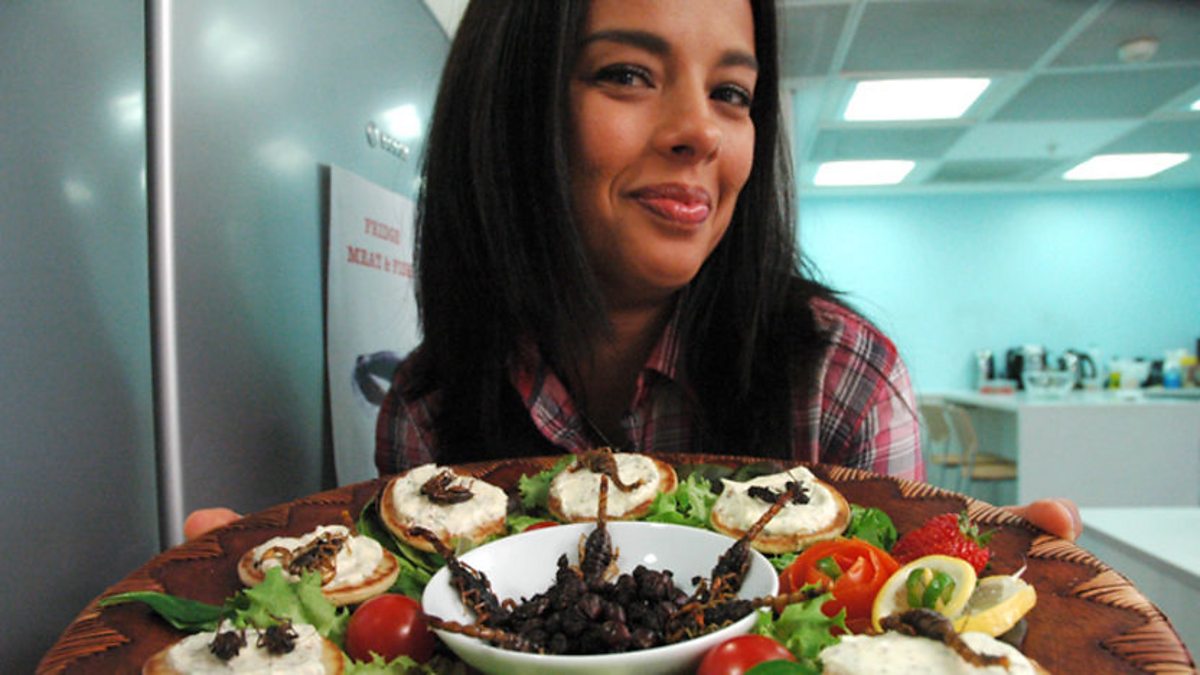 Liz cooks up some tasty looking and nutritious dishes - scorpion and locust blinis, anyone?