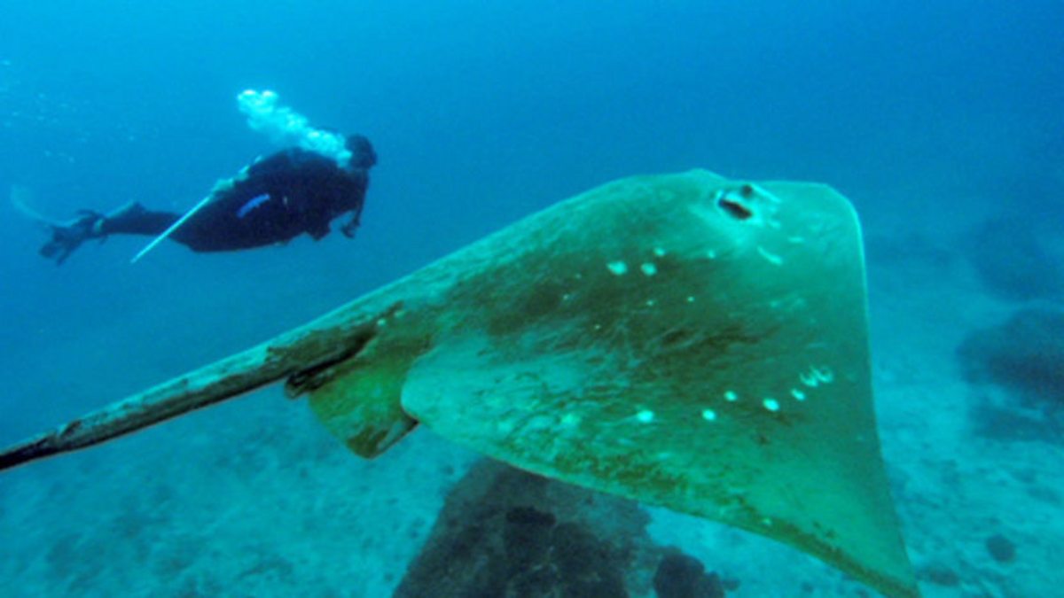 Diving down to Manta Reef, biologist Andrea Marshall spots one of the rarest creatures in the ocean. The small eyed stingray has only ever been seen alive off the Tofu reefs in Mozambique. Gliding effortlessly past the divers, this is the largest of the stingrays with a wingspan of 2.5m and this brief encounter is the first footage of them ever to be shown.