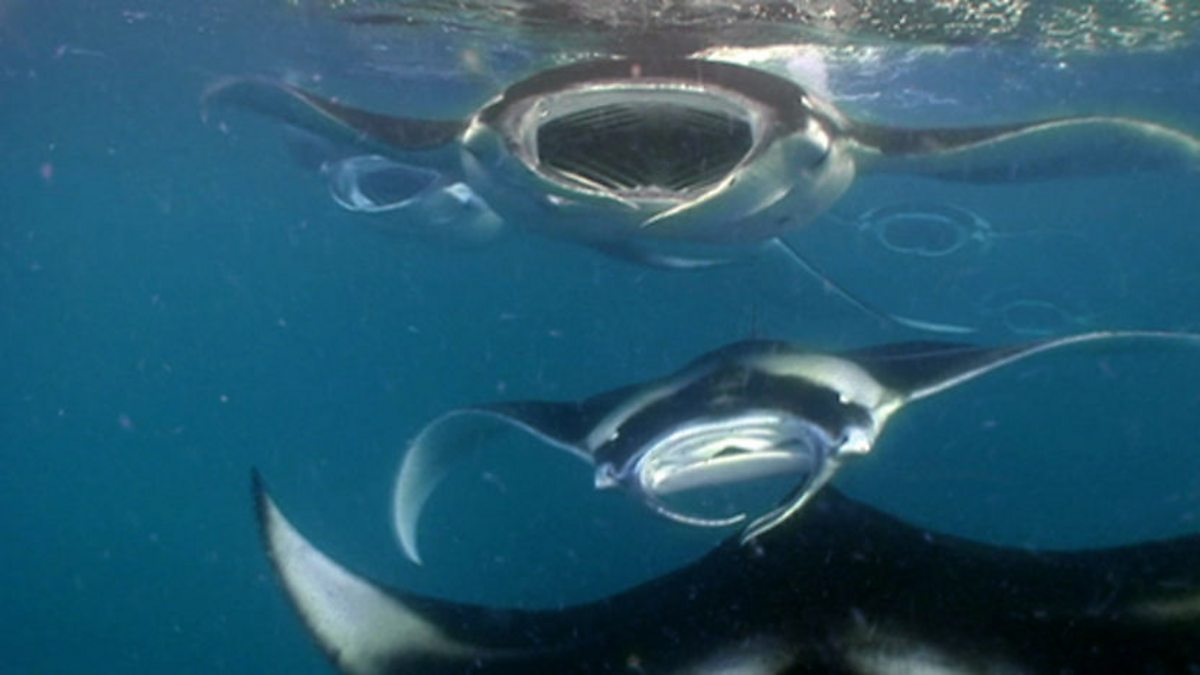 With the plankton higher up in the water column, great trains of mantas gather just below the waves to feed. They've learned exactly when and where to be for the most efficient feeding. They maximise their catch by lining up in a staggered formation moving up and down the lagoon to scoop up huge quantities of plankton. As the animal plankton sense the pressure waves from the approaching mantas, they try to escape, but the manta formation leaves the plankton with few places to go. Scooped into the mantas' mouths the plankton is sieved from the water with finger like structures called gill rakers. It's thought that mantas can harvest more than 17kg of plankton a day.