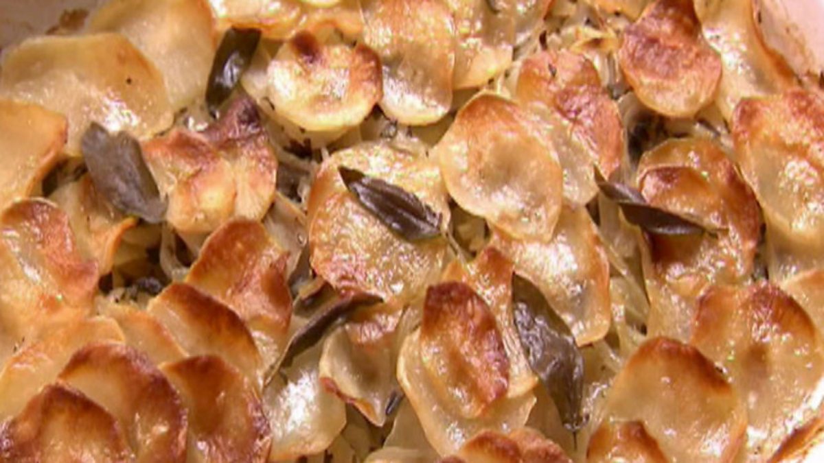 Delia's potatoes boulangère with sage is crisp and golden-brown on the top, soft and creamy within. It's perfect for entertaining, as the potatoes will sit happily in the oven without needing any attention.