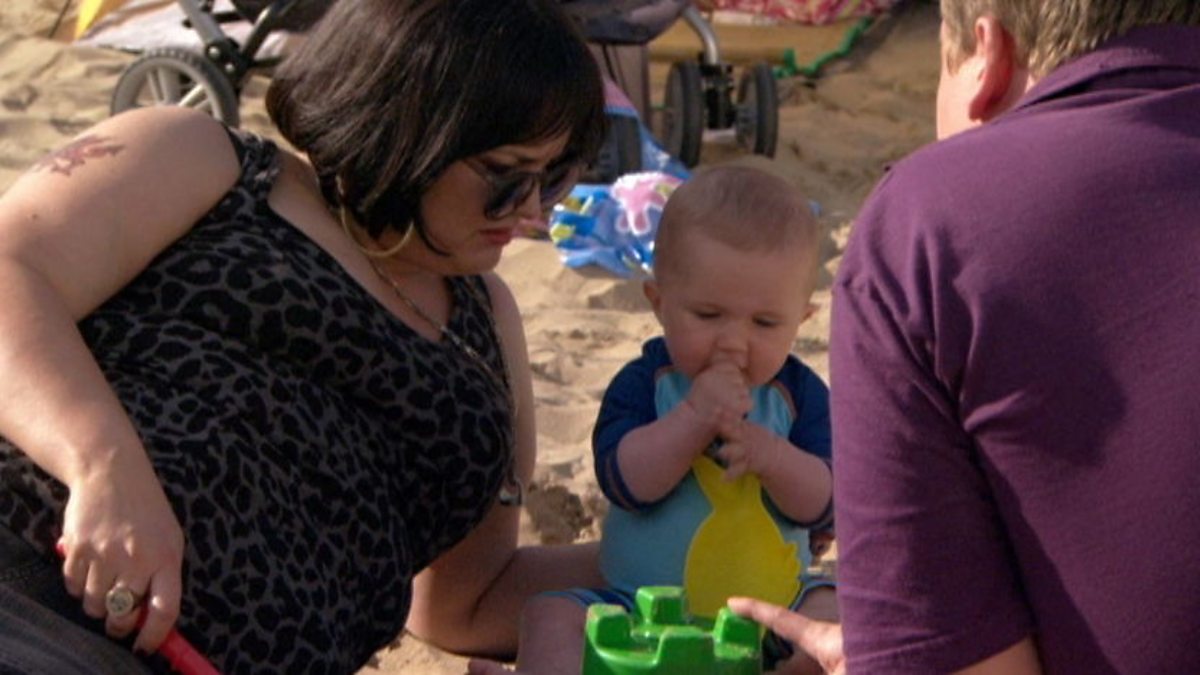 Nessa and Smithy teach Neil the baby how to make a sand castle.