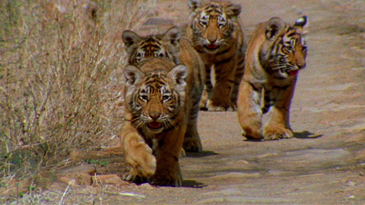 Ranthambore's newest family show themselves to Valmik Thapar. This female has four cubs between three and four months old, and it shows the tigers are doing brilliantly inside the park. Even in this tiger paradise, four cubs is an extremely rare sight. Valmik is delighted that the tigress is letting them follow her and her youngsters so closely as they walk along the road, especially as the cubs are so young. This must be one of their first walks in the open.