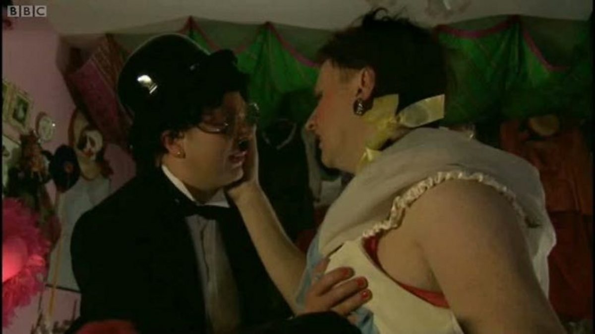 The League of Gentlemen is a sketch-based comedy set in the fictional town of Royston Vasey. In the first episode of series three, Pauline Campbell-Jones has been released from HMP Clitclink on the condition that she gains information about Mickey M Michael's family making illegal dole claims. In the process she realises her true feelings for Mickey and they unleash their passion at a fancy dress party.
