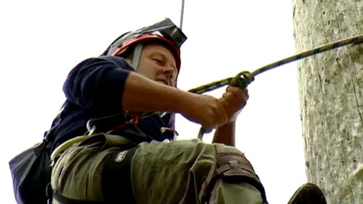 Archive footage from Landward's coverage of the Royal Highland Show 2006 as Euan McIlwraith braces himself to take part in the pole climbing event in the forestry arena.